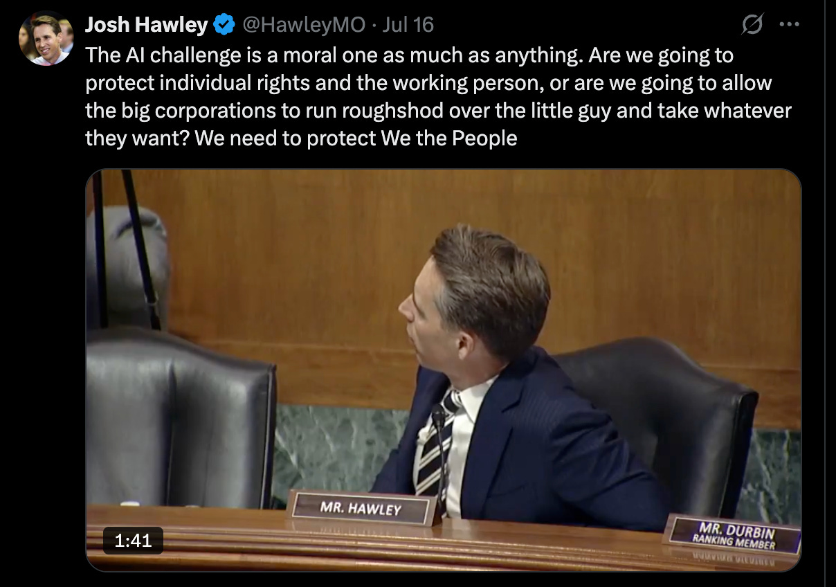 Senator Hawley also wrote about this on X, in a post that I read on the Acela train en route to Washington for our hearing Thursday morning: