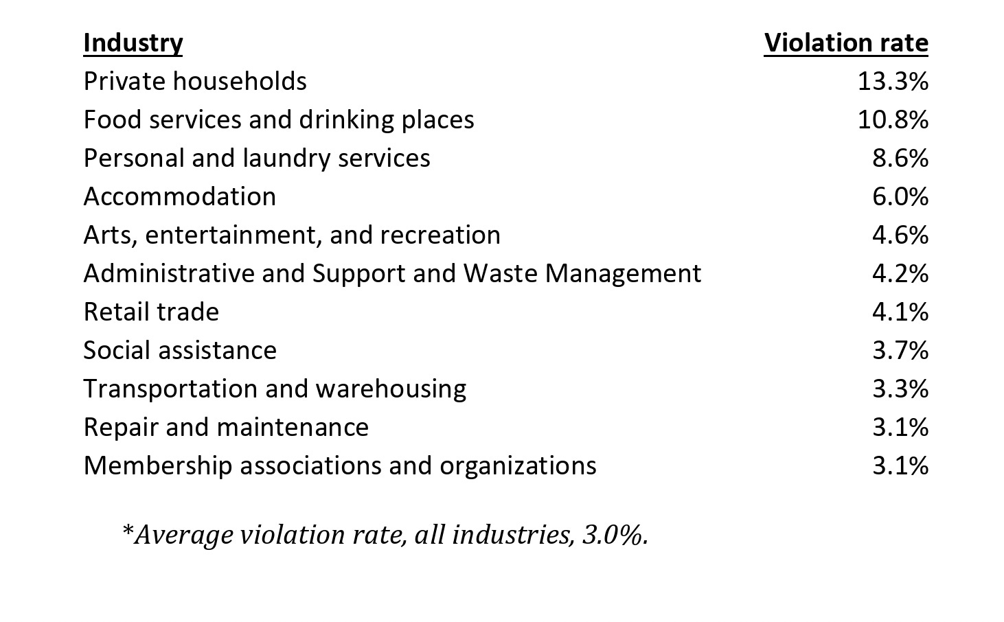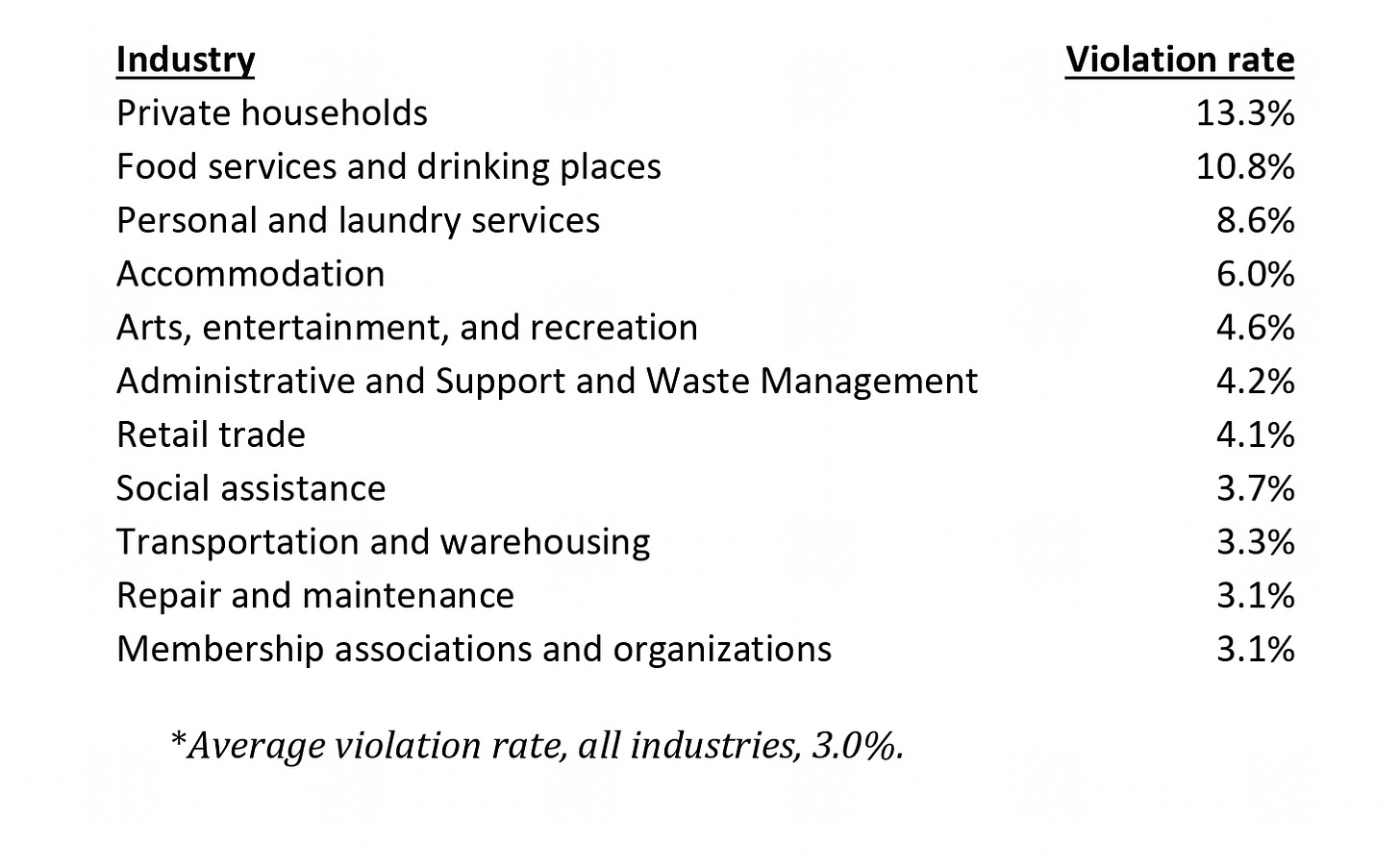 And on top of that, the most significant minimum-wage violation rates this 2022 Workplace Justice Lab research found weren’t occurring at companies, but instead in private households, specifically with regard to individuals employed as maids and child-care workers: