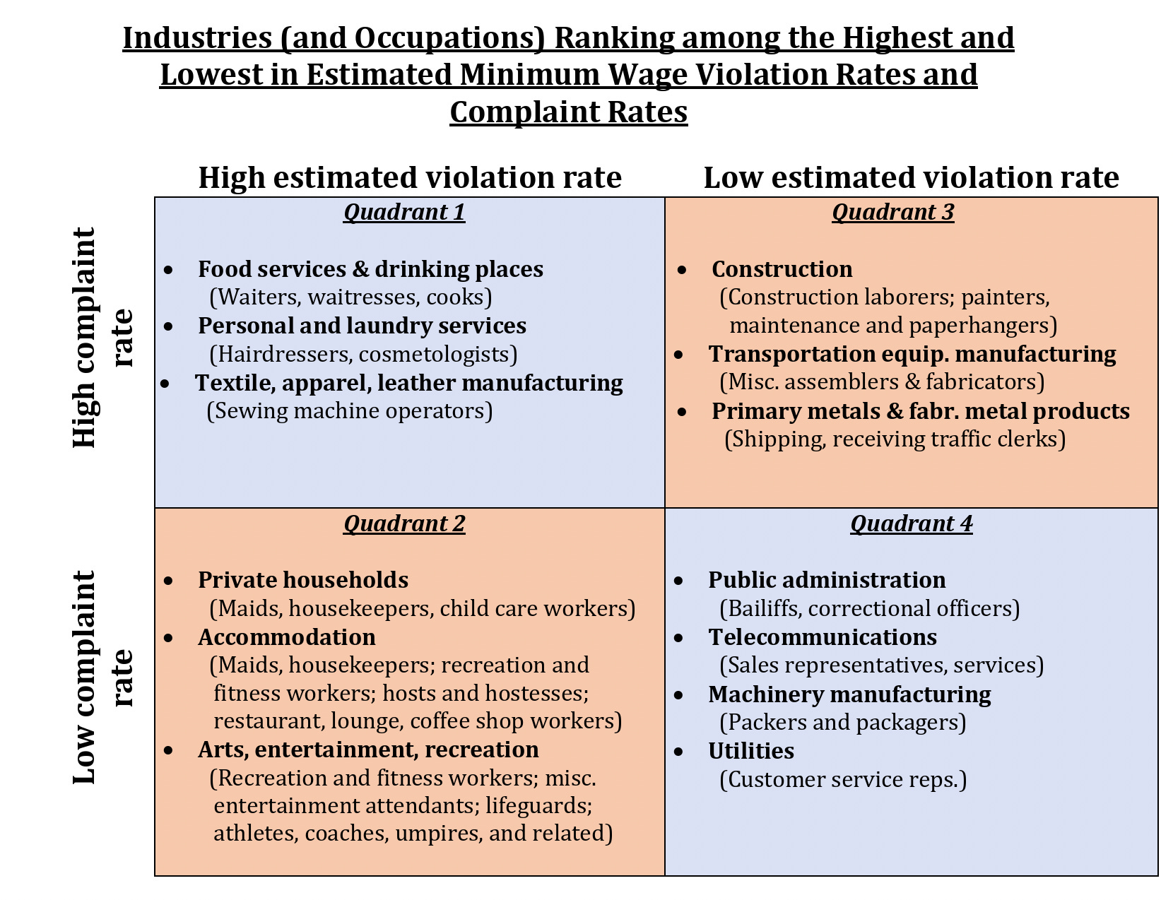 “Industries in Quadrant 3—construction, transportation and equipment manufacturing, and primary metals and fabricated metal products—yield many ‘false positives,’ meaning that the rate of minimum wage complaints received by the NJ DOL WHD significantly outstrips the estimated rate of violations in those industries. Violations in these industries are relatively rare, but workers in these industries tend to be highly ‘vocal.’ This means that NJ DOLWHD’s resources may be inefficiently allocated to investigating complaints in these industries.”