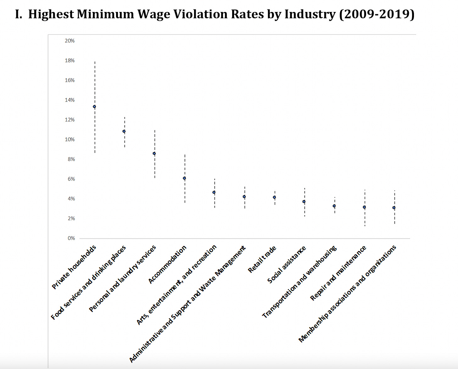 “Vulnerable workers, like those paid close to the minimum wage floor, like home health aides, construction workers, and janitors, are most susceptible to minimum wage violations.”