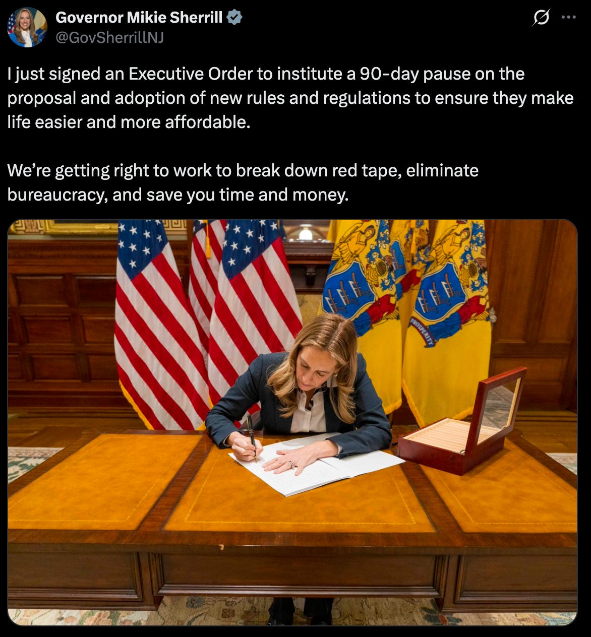 On Friday, New Jersey Governor Mikie Sherrill instituted a 90-day pause on rulemaking. She announced the move on X: