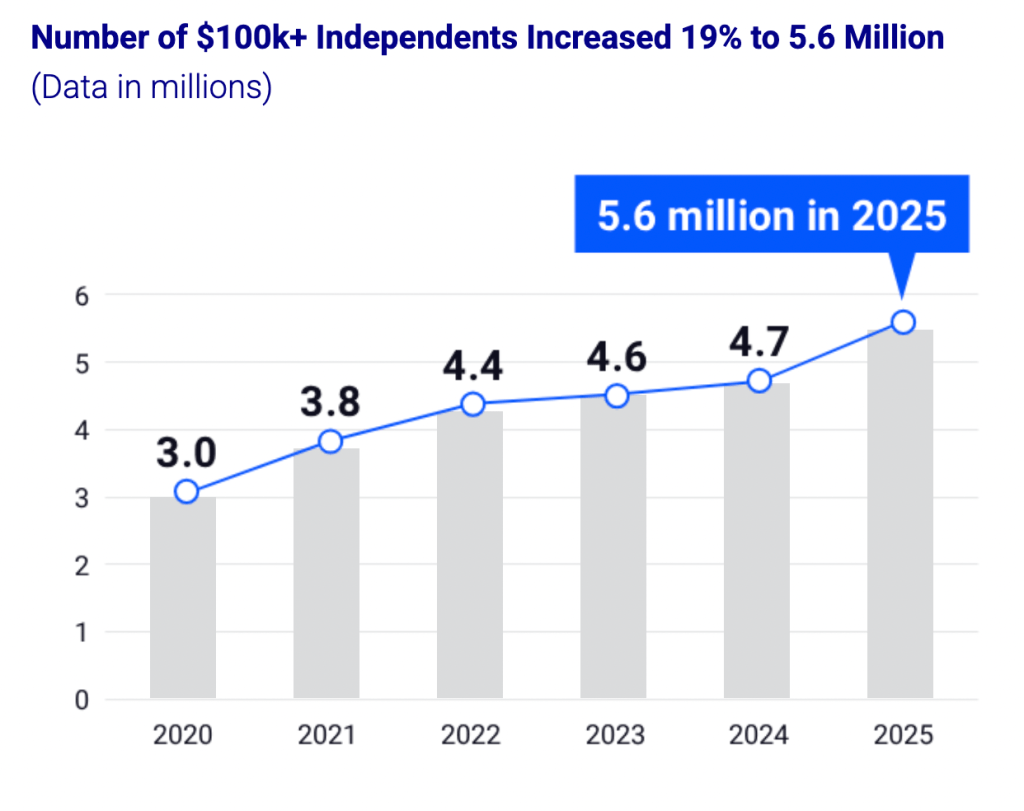 “The number of independents making more than $100,000 annually rose slightly in 2024 to 4.7 million from 4.6 million – that’s up sharply from 3 million in 2020.”