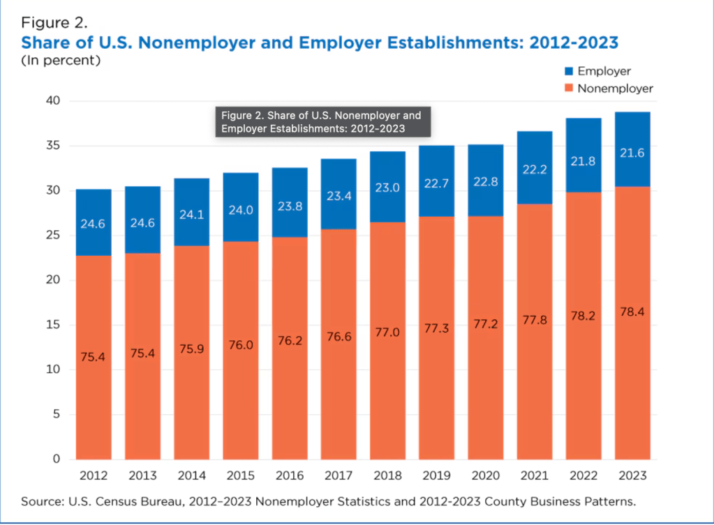 “The U.S. Census Bureau data show annual growth of nonemployer establishments (those with no paid employees) almost always outpaced that of employer businesses (those with at least one paid employee). Nonemployers also represented a larger share of all U.S. businesses each year from 1997 to 2023 .”