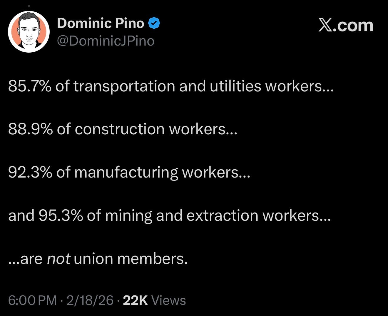 That’s even truer today than it was yesterday, with the Bureau of Labor Statistics releasing the latest union-membership figures. Dominic Pino, a Washington Post opinion writer, broke down the new data last night in a thread over on X.