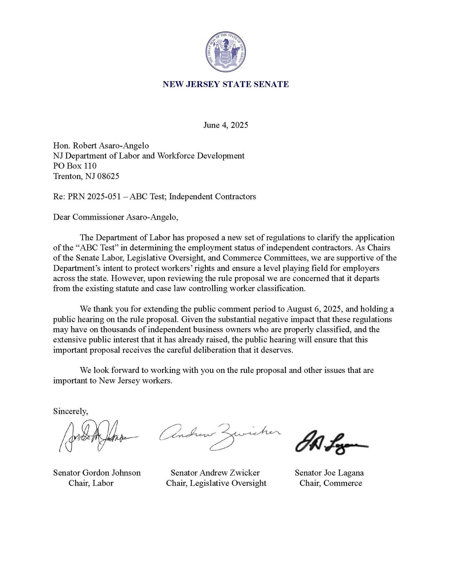 On June 4, three of New Jersey’s state senators—Labor Committee Chairman Gordon Johnson, Legislative Oversight Committee Chairman Andrew Zwicker, and Commerce Committee Chairman Joe Lagana—sent this letter to New Jersey Labor Commissioner Robert Asaro-Angelo: