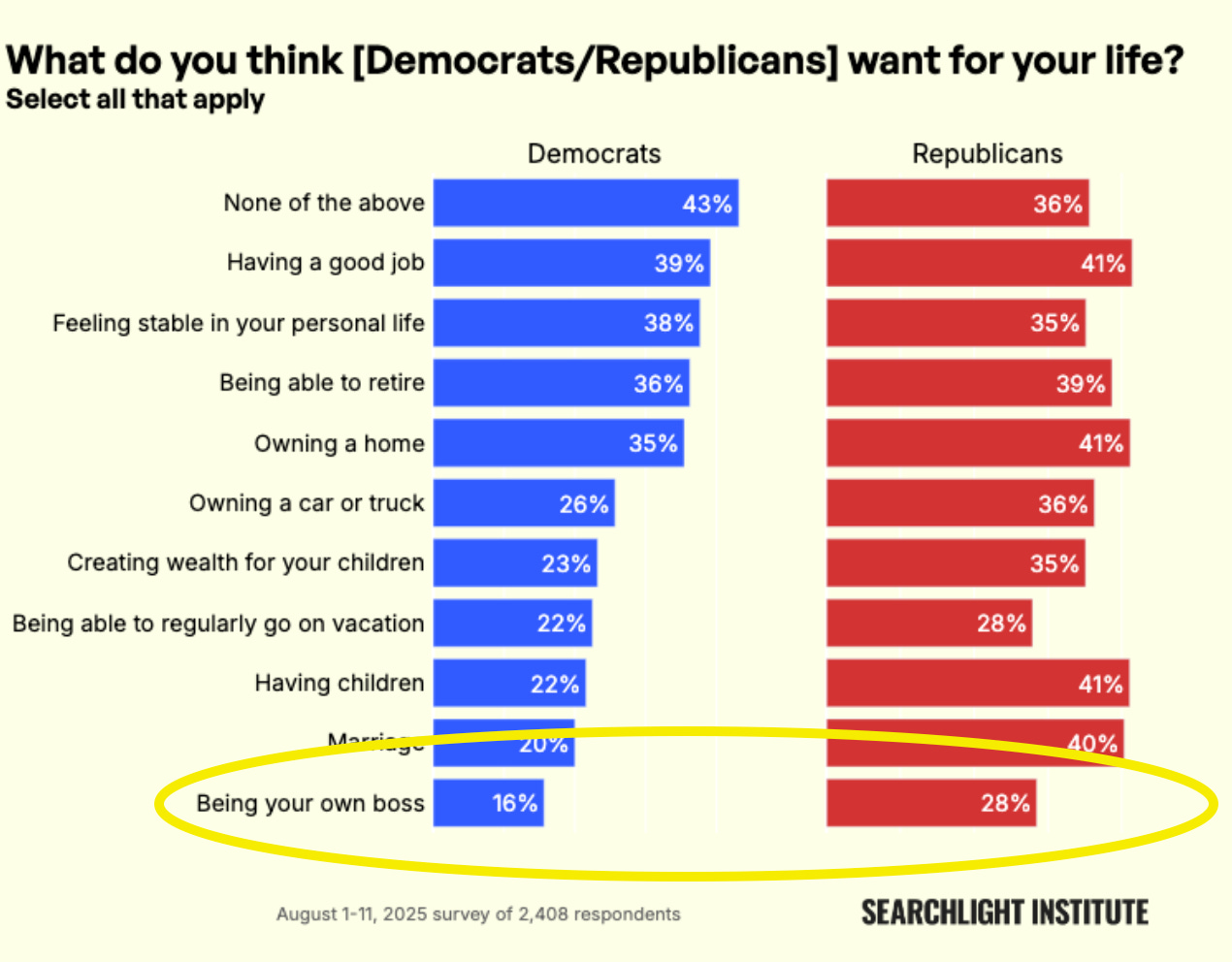 But only Palagashvili is saying it in the same way that the vast majority of Americans—Democrats and Republicans alike—are saying it. While Takano is arguing that we have to force people back into the kinds of traditional union jobs that existed in the 1950s, most Americans today are instead saying that lawmakers in both political parties could be doing a whole lot more to support for our desire to be our own bosses.
