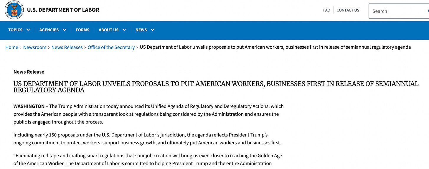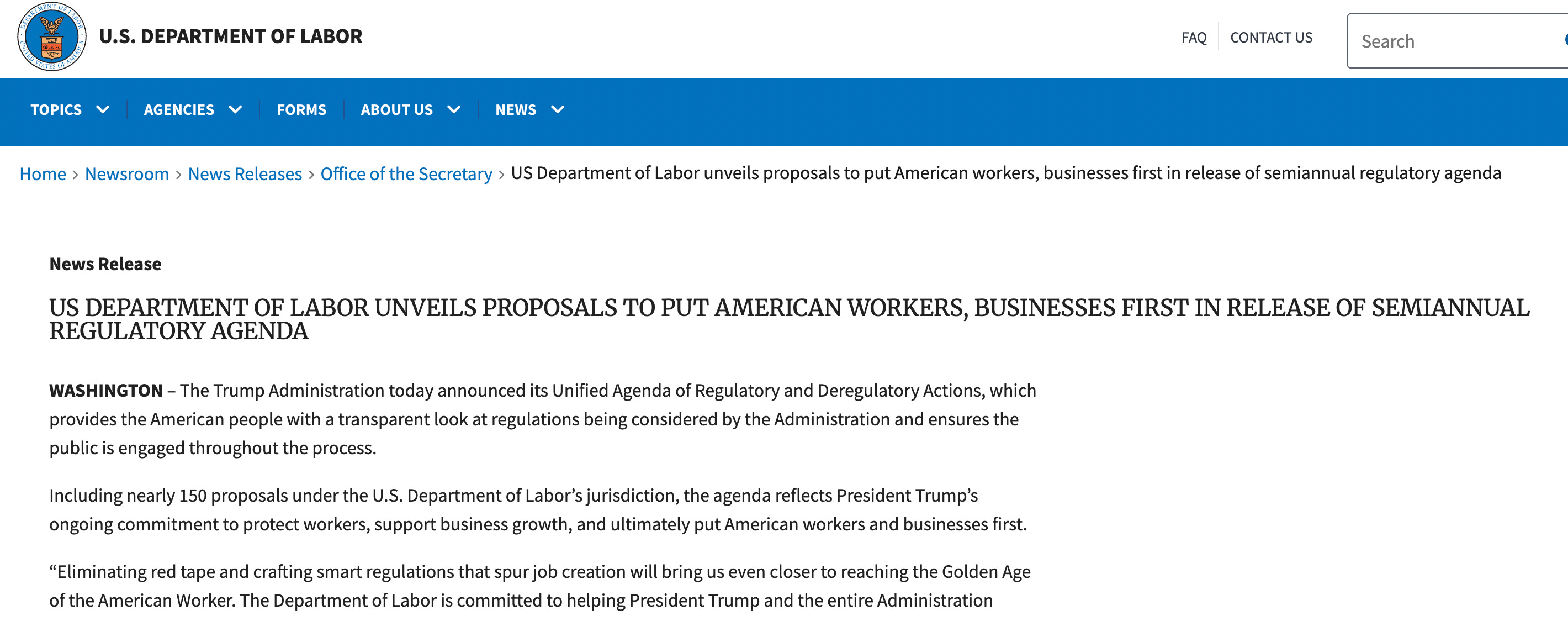 Today, the U.S. Department of Labor issued a press release announcing the Trump administration’s Unified Agenda of Regulatory and Deregulatory Actions. This agenda lists various regulations the administration is considering.