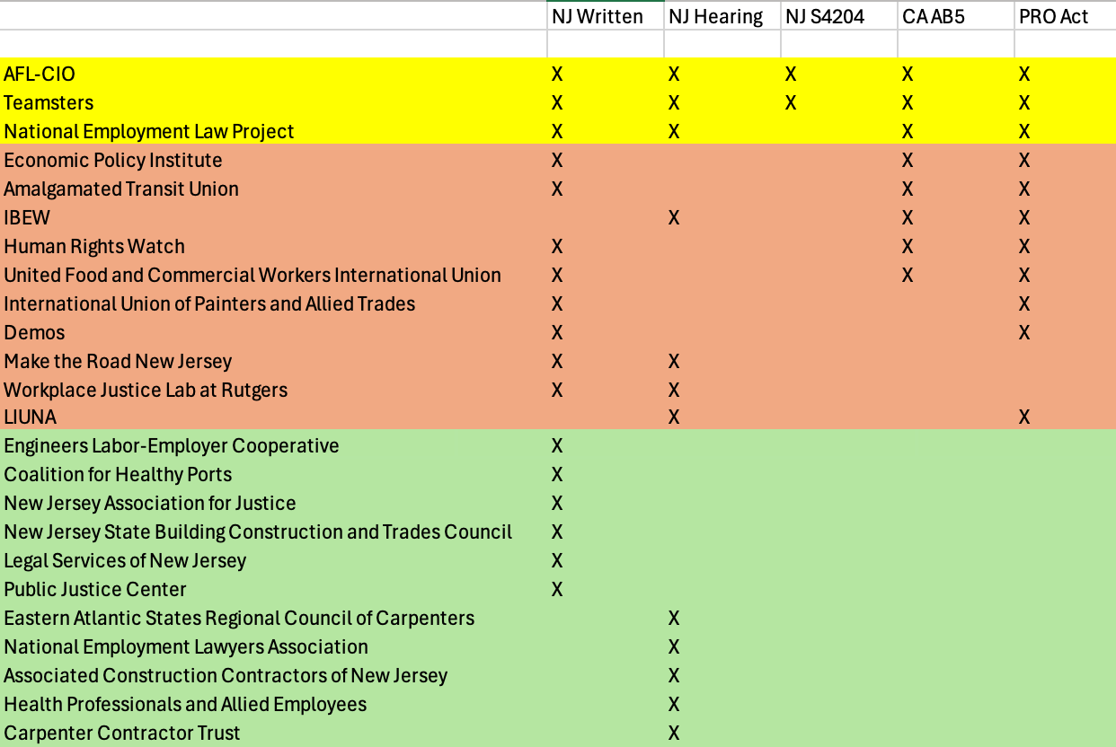 On the chart below, the left side lists the names of unions and other organizations whose representatives spoke in support of New Jersey’s rulemaking at the public hearing, and/or filed written comments in support. To the right in the chart, you can see which of those same organizations—in an effort now spanning the better part of a decade—also supported California’s Assembly Bill 5 to restrict independent contractors in that state, New Jersey’s Senate Bill 4204 that was based on California’s AB5, and/or the federal PRO Act that would inject AB5’s regulatory language into federal labor law as a way to target independent contractors everywhere.