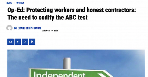 Yesterday, BINJE published an op-ed by Fishbaum. He writes about the interpretation of ABC Test regulatory language that New Jersey’s Labor Department is trying to impose through rule-making. The op-ed’s headline suggests that anyone who is an “honest” independent contractor would support the Labor Department’s proposal: